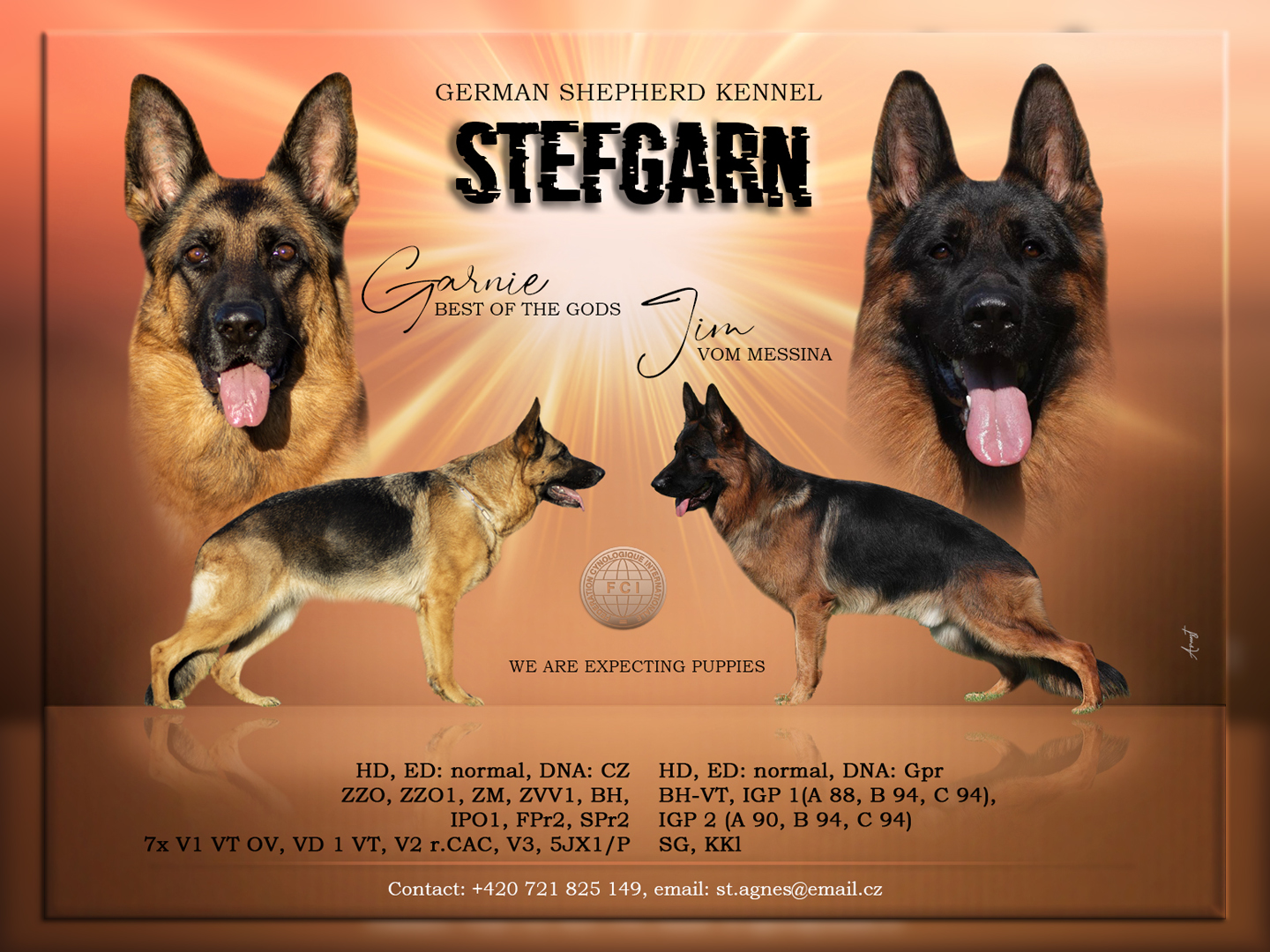 1.2.2021 se narodila štěňátka po krásném mladém psovi a naší Garnii Best of the Gods. Více info v sekci štěňata a odchovy.